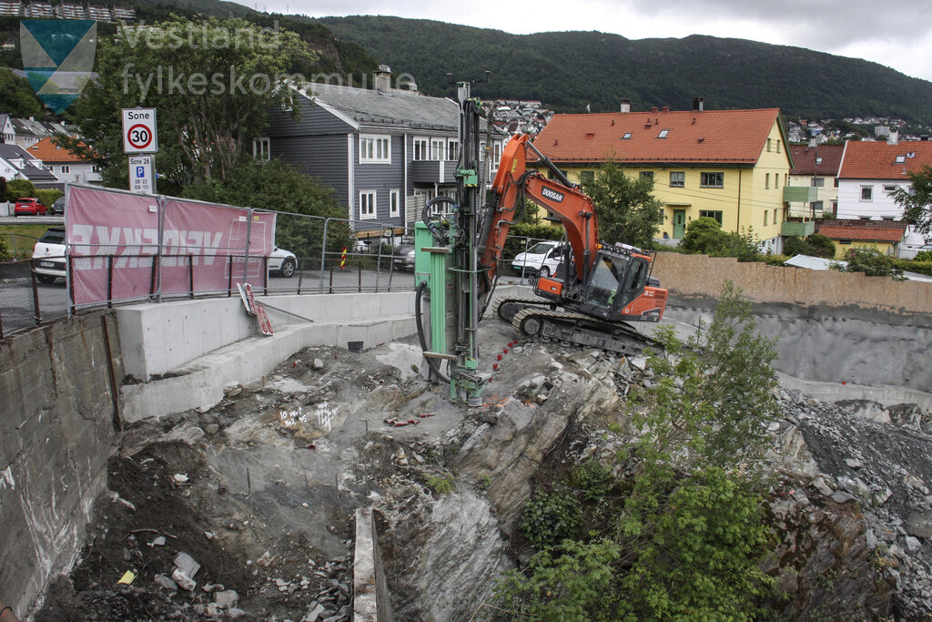 Historisk bilete frå bygginga av Kronstad haldeplass for Bybanen linje 2 til Fyllingsdalen