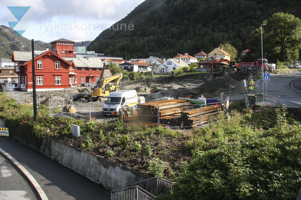 Historisk bilete frå bygginga av Haukeland sjukehus haldeplass for Bybanen linje 2 til Fyllingsdalen