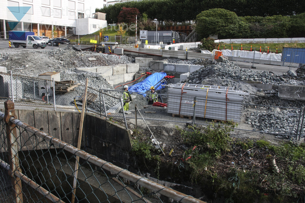 Historisk bilete frå bygginga av Haukeland sjukehus haldeplass for Bybanen linje 2 til Fyllingsdalen