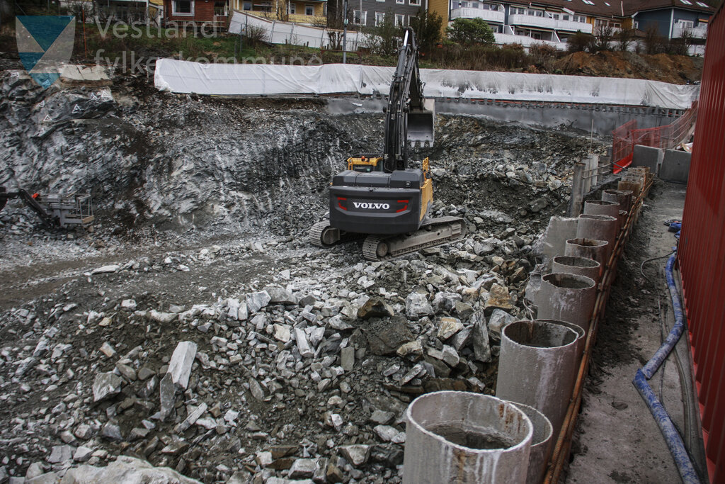 Historisk bilete frå bygginga av Fløen haldeplass for Bybanen linje 2 til Fyllingsdalen