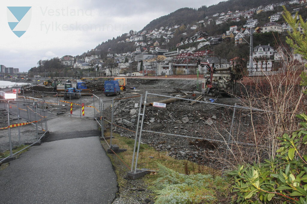 Historisk bilete frå bygginga av Fløen haldeplass for Bybanen linje 2 til Fyllingsdalen