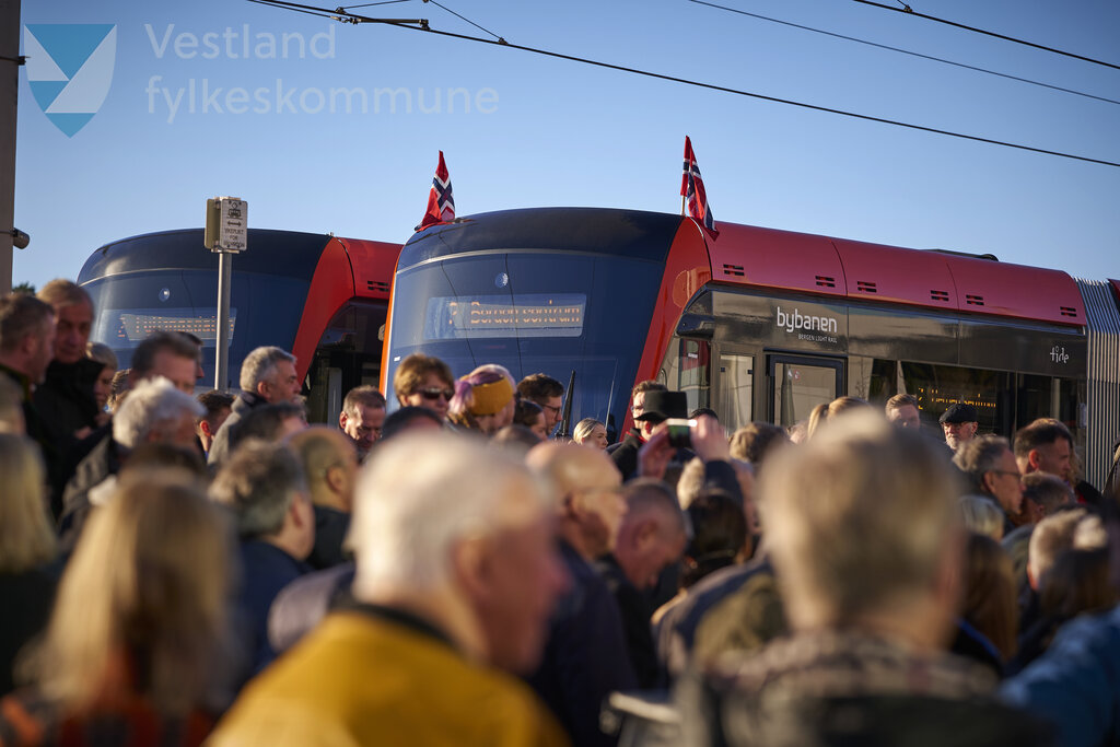 Biletet syner menneske som var til stades under markeringa av at Bybanen til Fylingsdalen er ferdig