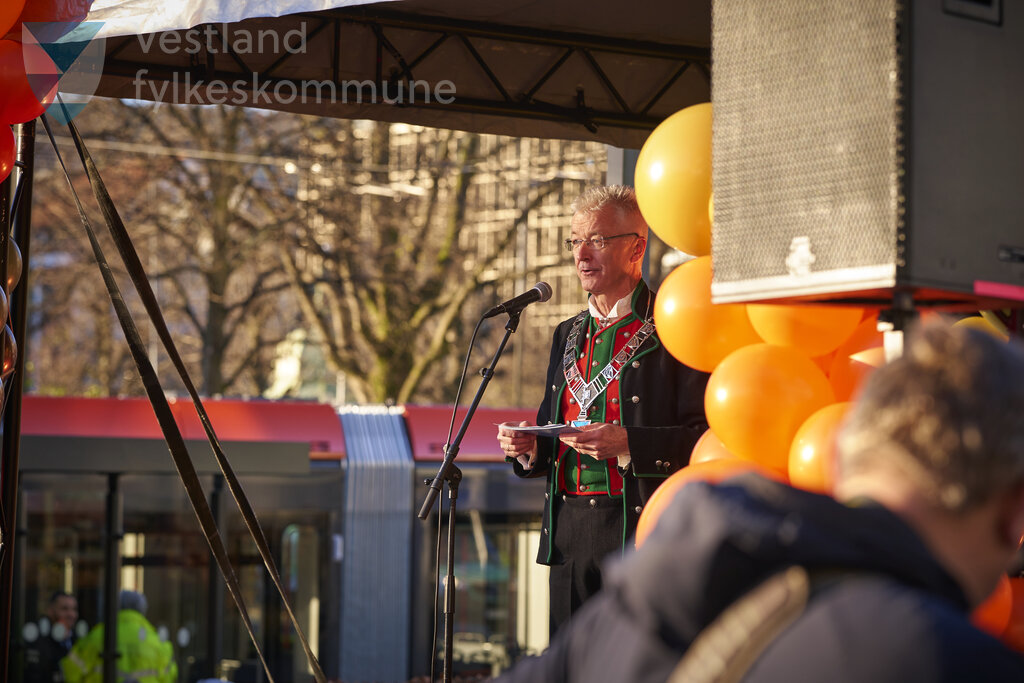 Biletet syner menneske som var til stades under markeringa av at Bybanen til Fylingsdalen er ferdig