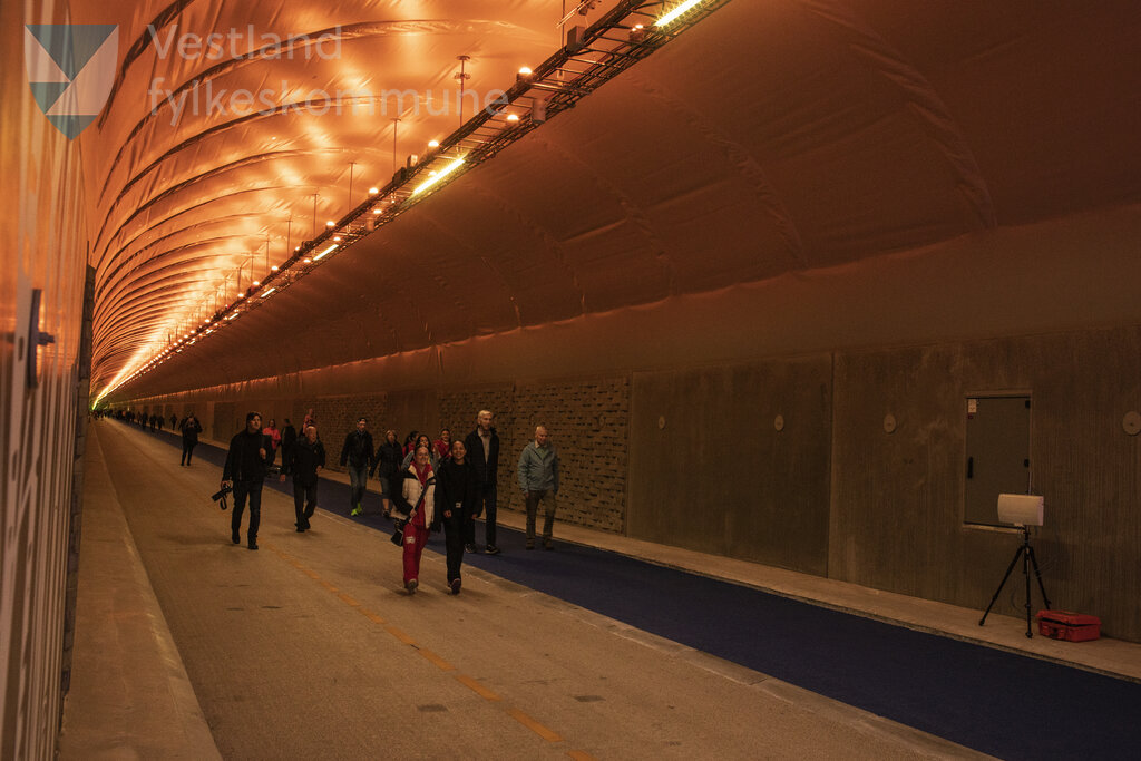People taking their first walk through the Fyllingsdalen tunnel. Photographed in Fyllingsdalen Bergen 14.04.2023 during the opening day of the new Fyllingsdalen Tunnel. Worlds longest pedestrian and bike tunnel.