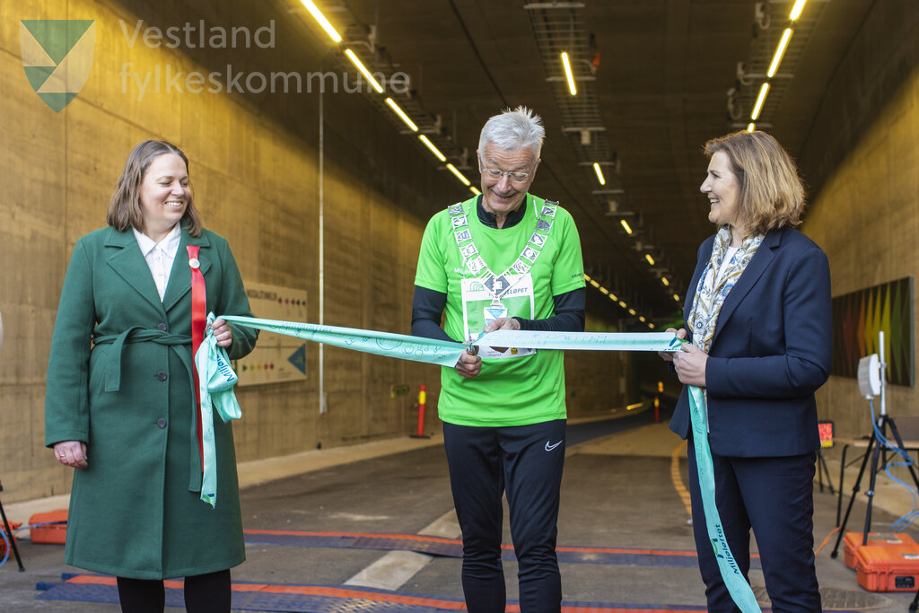 Klima og Byutviklings-byråd Ingrid Nergaard, Fylkesordførar Jon Askeland, og vegdirektør Ingrid Dahl Hovland Fotografert 14.04.2023 i Fyllingsdalen, Bergen, i forbindelse med åpninga av Fyllingsdalstunnelen, verdeas lengste gang og sykkeltunnel.