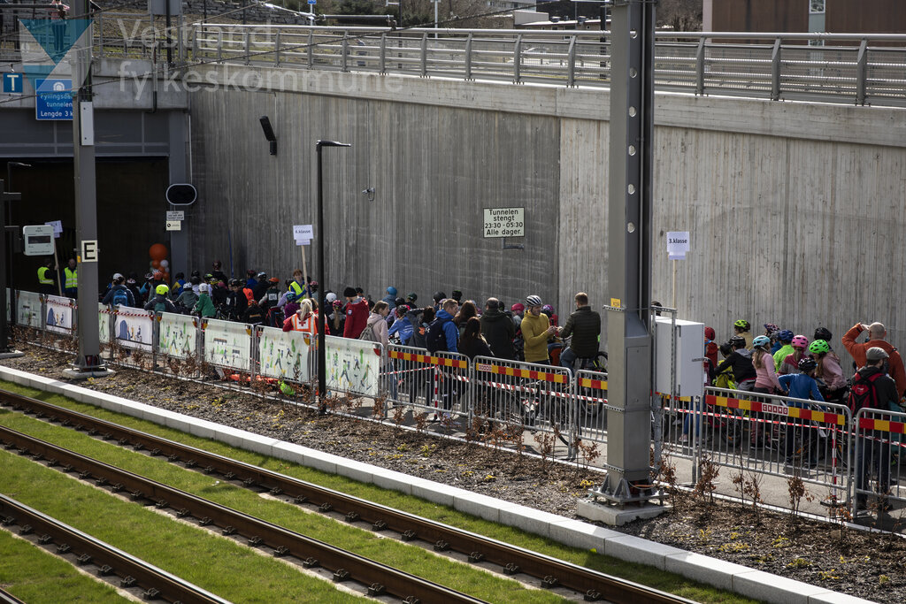 Deltakarar i barnas sykkelres Fotografert 14.04.2023 i Fyllingsdalen, Bergen, i forbindelse med åpninga av Fyllingsdalstunnelen, verdeas lengste gang og sykkeltunnel.
