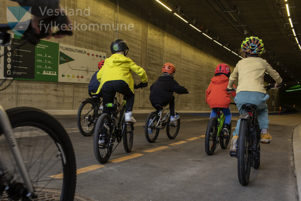 Deltakarar i barnas sykkelres Fotografert 14.04.2023 i Fyllingsdalen, Bergen, i forbindelse med åpninga av Fyllingsdalstunnelen, verdeas lengste gang og sykkeltunnel.
