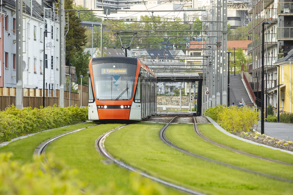 Bybanen i nærheten av Kronstad med linje 2 i trafikk langs traseen. 23.05.2023 Bergen