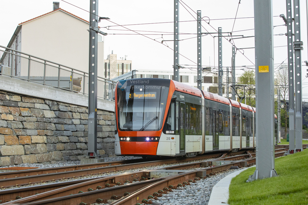 Bybanen i nærheten av Kronstad med linje 2 i trafikk langs traseen. 23.05.2023 Bergen