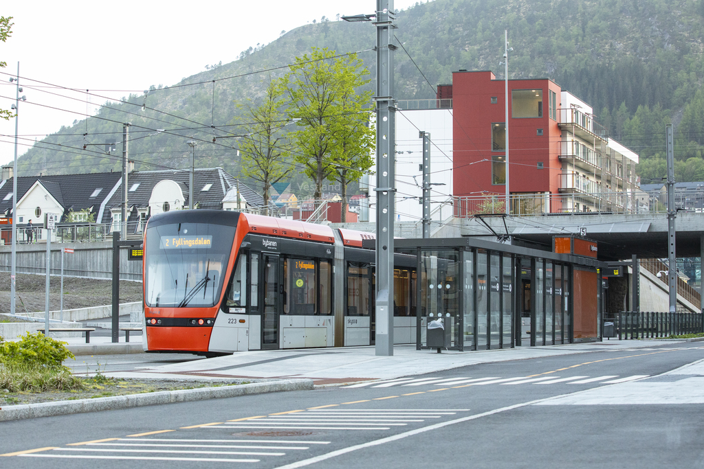Bybanen på Kronstad Haldeplass ved linje 2 i trafikk langs traseen. 23.05.2023 Bergen