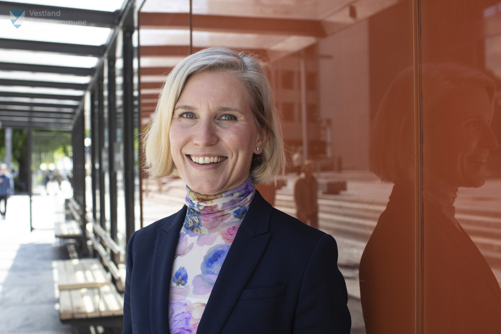 Administrerende Direktør Birgit Farstad-Larsen (COWI) Fotografert 2.Juni 2023 i Kaigaten i Bergen i forbindelse med signering av kontrakt E03 - Prosjektering av Bybanen til Åsane som skal gjøres av COWI Rambøll og Asplan Viak